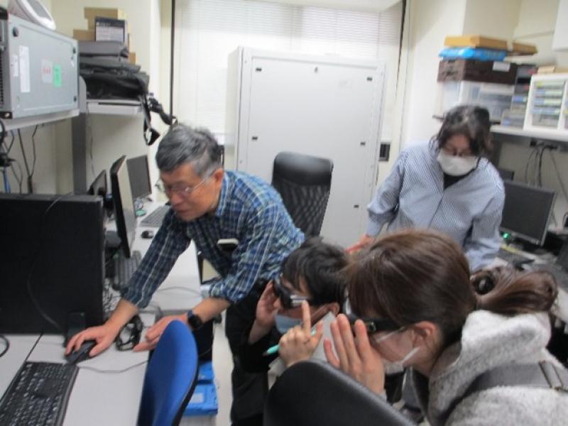 午後からは、今年度から新たな研究室見学先として異分野基礎科学研究所国際構造生物学研究センターの沈建仁教授、沼本修孝准教授(特任)、蔡弼丞助教(特任)(すべて学術研究院先鋭研究領域)から、クライオプラズマFIB-SEM Thermo Scientific Arctisとクライオ電子顕微鏡 Thermo Scientific Krios G4についての説明があり、最先端の機器に触れました。特殊なメガネを使って解析された分子構造の画像を立体的に見ることができ、データ解析のための情報量の多さに一同驚いていました。初日の最後には、自然生命科学研究支援センター分析計測・極低温部門分析計測分野の砂月幸成准教授(学術研究院教育研究マネジメント領域)、塩川つぐみ技術専門職員からICP発光分光分析装置、LC/QTOF質量分析システムやNMR装置の説明があり、これら最新機器の見学をしました。