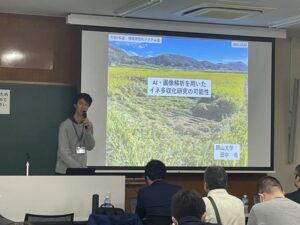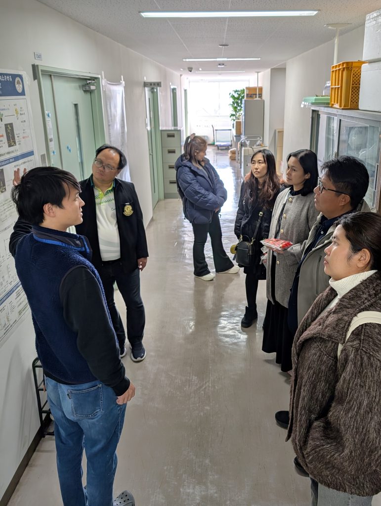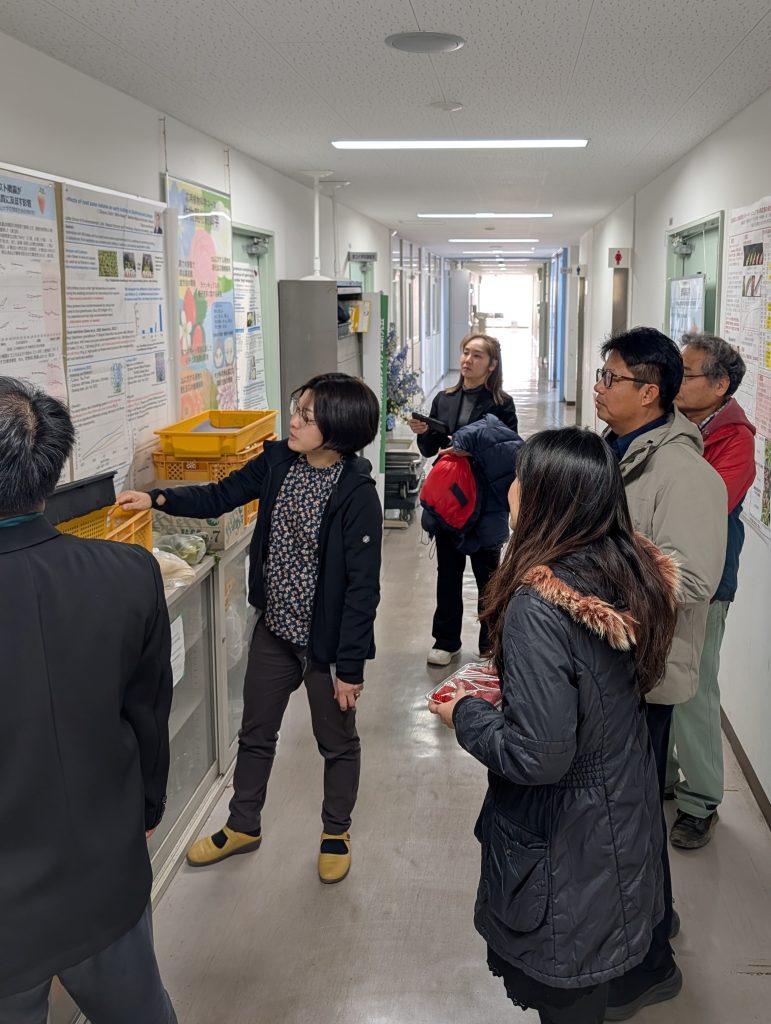一行は農学部の研究室を見学し、研究内容や今後の交流について意見交換を行いました。その後、岡山大学農学部長 一瀬勇規教授、岡山大学学術研究院環境生命自然科学学域(農)の中嶋佳貴准教授と本学の大学院生1名、学部生2名を交えて昼食交流会を実施し、和やかな雰囲気の中で学生生活や研究紹介を通じた交流が深まりました。