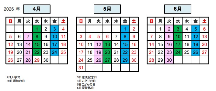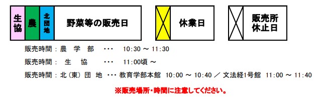※上記カレンダーの色塗り日(土日祝日および×印箇所を除く)は、出張販売(農学部1号館玄関、生協、北団地)実施日ですが、当日は、センター内の販売所でも農産物販売を行っております(営業時間 13:30-14:30)。